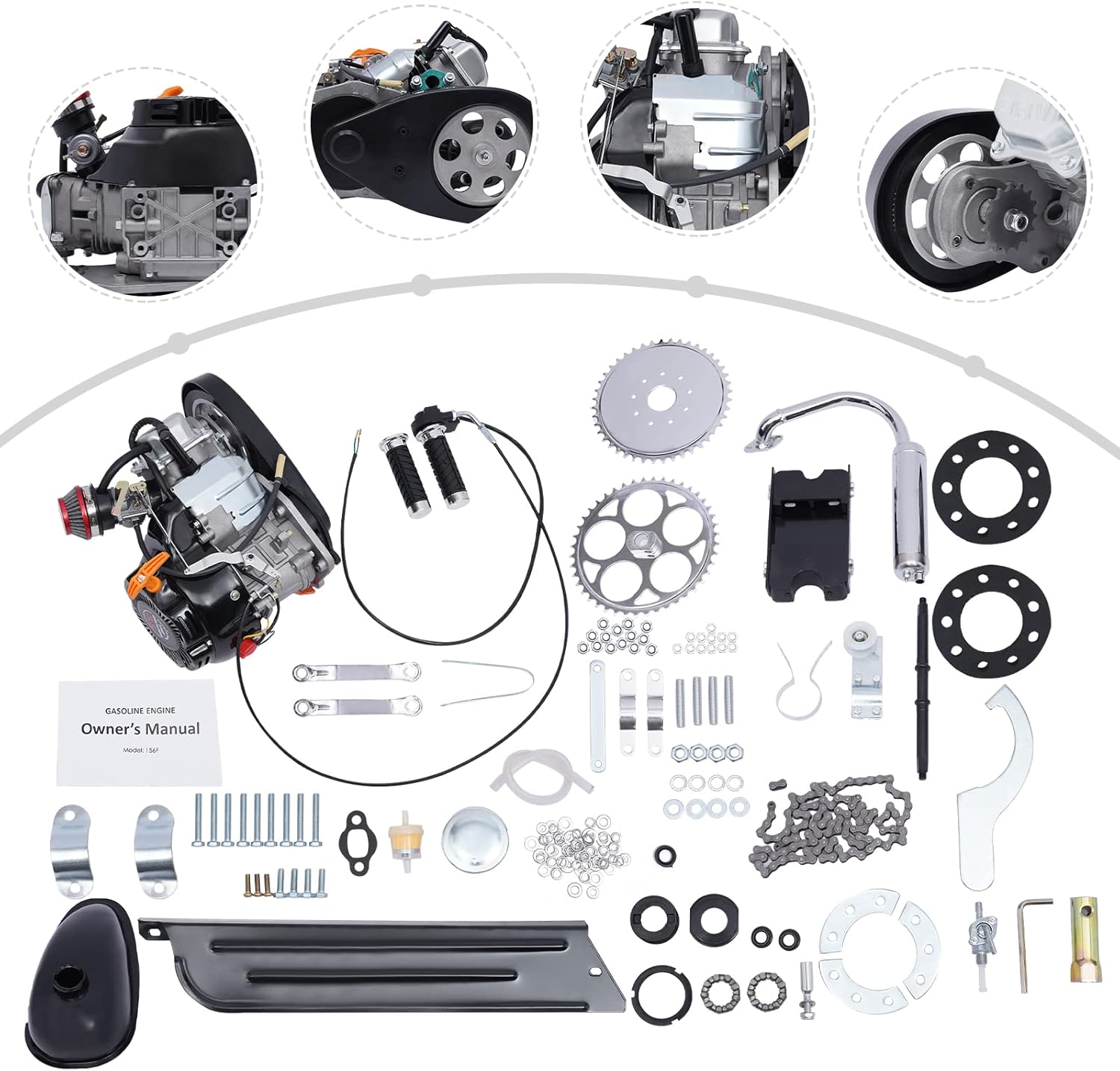 Key Features Trouble-free Installation 100cc 4-Stroke Gasoline Engine Complete Kit Large Capacity Fuel Tank Low Fuel Consumption Safe and StableSpecifications Model: EZ-156F Type: Forced Air Cooling, 4-Stroke, OHV, Single-cylinder, Inclined by 25 Degrees Starting System: Recoil Start Material: Aluminum, Iron, and Plastic Color: Black, Silver Max Output: 3HP Rated Power: 2KW/3600rpm Max. Torque: 4.5N.m/2500rpm Fuel Tank Capacity: 1.6L/0.42gal Fuel Consumption: <420 g/KW.h Oil Capacity: 0.4L/0.1gal Oil Consumption: <6.8 g/KW.h Min. Stable Speed Unloaded: 3600rpm Reduction Ratio: 1:1 Bore x Stroke: 56x40 mm Displacement: 100cc Compression Ratio: 7:1 Product Size: 28.5*35*28cm/11.2*13.7*11in Packing Size: 73*34*25cm/28.74*13.38*9.84in Gross Weight: 21kg/46.29lbs Net Weight: 20kg/44lbsFits (As a Reference)For Beach Bikes with Large Triangular Frame SpacePackage Included1* 100cc 4-Stroke Gasoline Engine1* Fuel Tank1* Base Bracket1* Exhaust Pipe1* 44 Tooth Chain1* Chain Tensioner 1* Belt1* Guard 2* Fixed Iron Pieces1* Spark Plug Tool1* Fuel Line