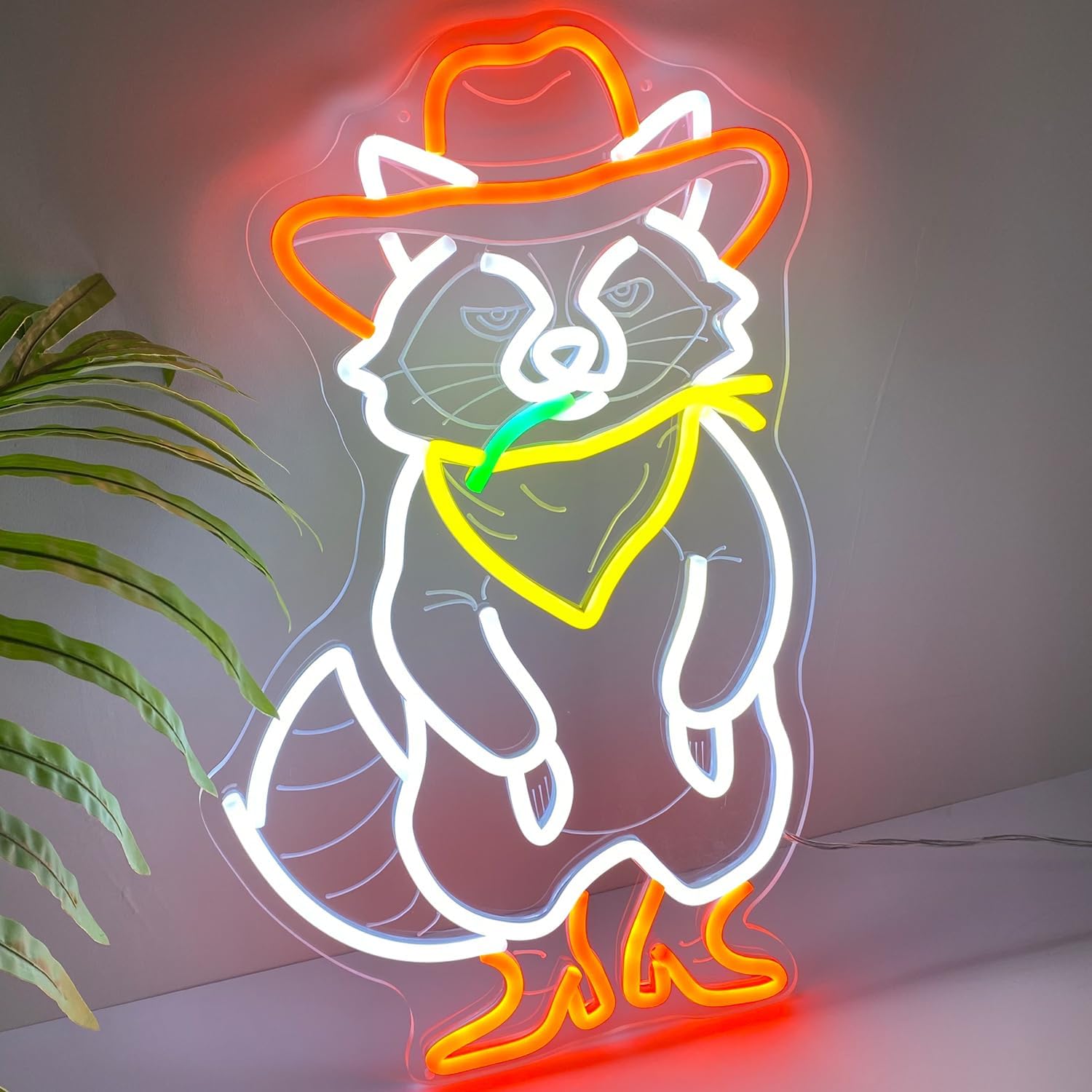 Light up this cool cowboy raccoon grass neon sign, emitting a chic, bright light, adding more personality to the room and becoming the focus.Who We Are:MIMAIK Sign Co. Limited is a leading global LED Neon Signs company having its headquarter in Hong Kong and its own factory in China.We have been focusing on neon products and are committed to providing every customer with beautiful, environmentally friendly products and professional, on-point service.Many places and occasions can be fascinated by placing our neon signs- Bedroom, Home, Restaurant, Bar, Party, Hotel, Shop, Company, Celebration, Wedding, etc.Product Dimensions:Size: 18 x 11.2 inchesWeight: 3 lbCable length: 58 inchesProducts include: 1x Neon Sign, 1x Installation Kits, 1x Adapters and Plugs, 1x Dimmer SwitchMaterial: Acrylic + LED flex neon strips Easy Installation: With the design of pre-drilled holes, you can put or hang it anywhere you want. Light Mode: Steady LightVoltage: 12V This is a warming and sweet gift for family, friends, kids.