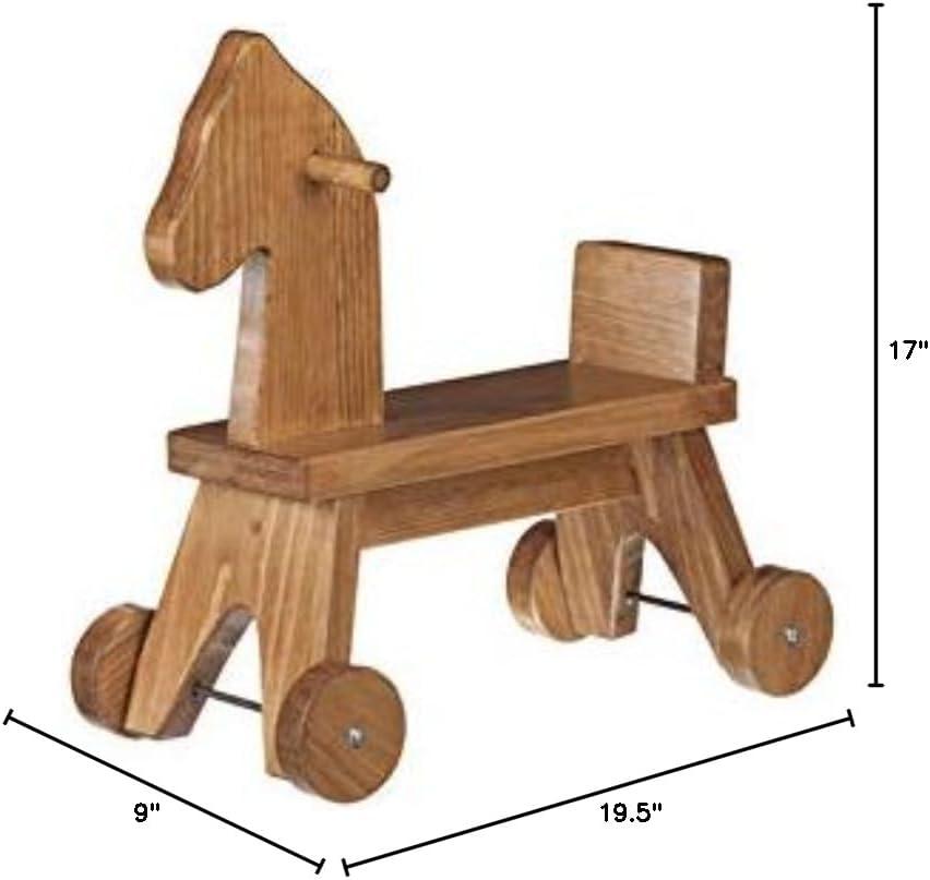 Encourage your child to work on his motor skills by teaching him to "walk" this horse around. Watch their eyes sparkle as they pretend to rope the racing cattle or ride a bucking bronco. The wooden horse toy is made by Amish folks in scenic Lancaster County, Pennsylvania. Rolling wooden wheels allow for free movement of the horse and rider. This Riding Horse Toy comes with a child-safe Harvest Stain Finish. The dimensions are 17"L by 9"W by 19.5"H.