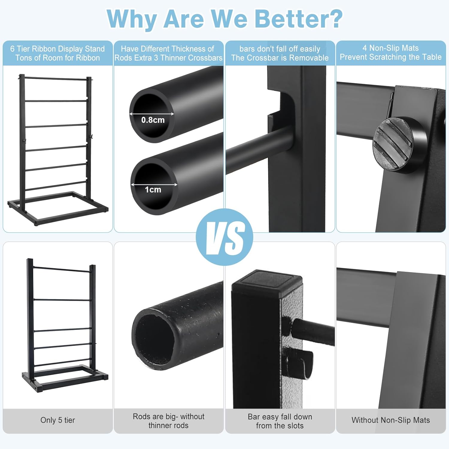 AULIN 6 TIER LARGE CAPACITY RIBBON ORGANIZER Specifications: Product Name: Ribbon Holder Organizer Rack for Crafts Material: Iron Color: Black Style: Modern Size: 17.7x11.8x29.5 inch/45x30x74cm Package Includes: 1x Storage Rack 1x Instruction Whether assembly is required: Yes Usage scenario: Perfect for craft room, gift shop, flower store, studio, shopping counter, clothes store A good helper that save you from a mess: METAL RIBBON Gift Wrapping Paper Belts Fabrics Scarves Towels Ties Why you need it? 1. The ribbon holder can keep the ribbons of different sizes neat and help to improve the efficiency of space utilization. 2. There is plenty of space for your ribbon and spool, so you can quickly refill or replace the ribbon as needed. 3. This benchtop display stand is designed for both home and commercial use. A stylish classic for any occasion. One glance catches the customer's eye. 4. No need to worry about desktop clutter, with this versatile shelving, create a comfortable, clean, and uncluttered environment for your shop or home.