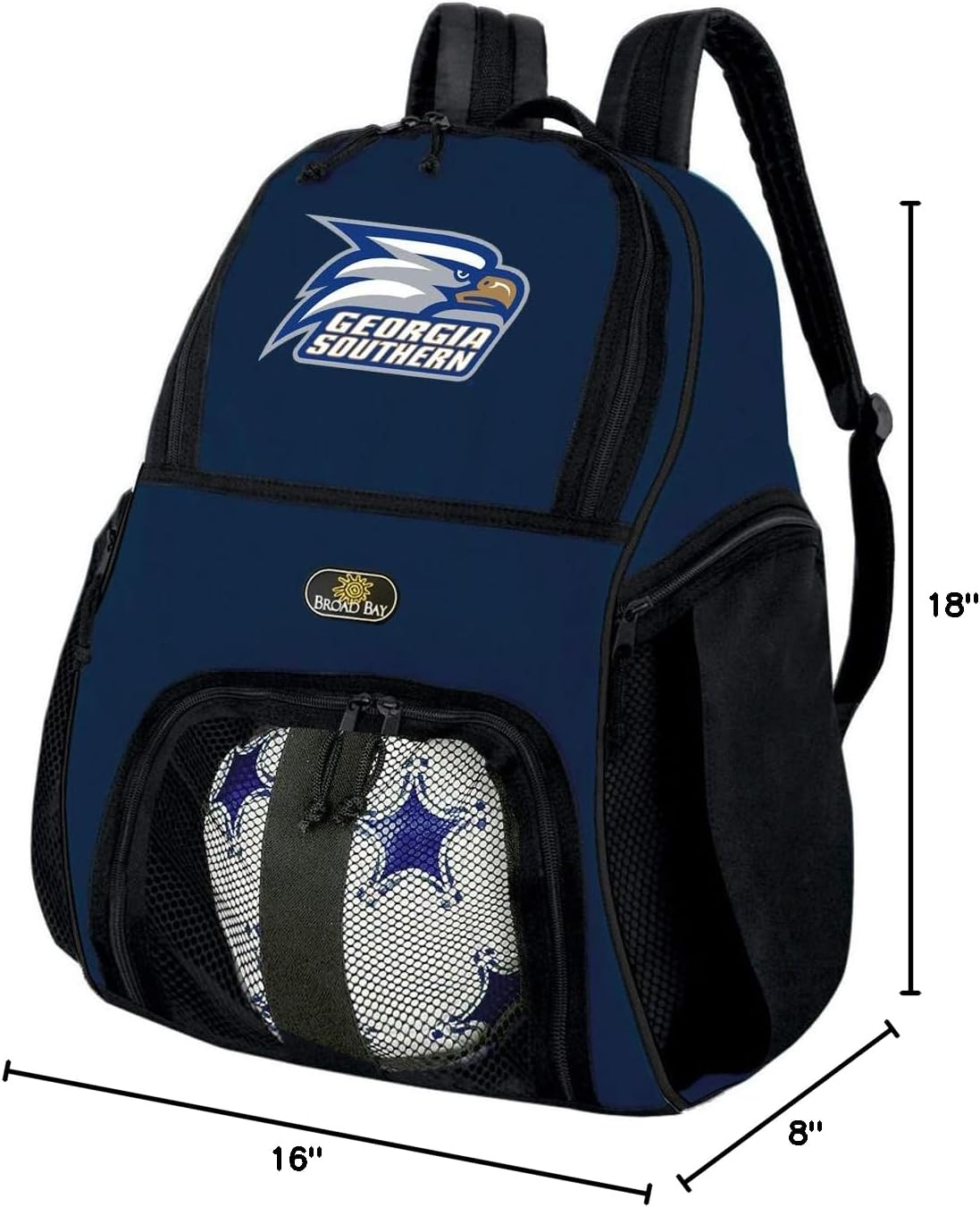 This well made college logo Georgia Southern ball backpack is the perfect solution for soccer or basketball practice. Made of heavy duty 600D polyester with soft backing, the mesh paneled interior ball compartment allows you to quickly and easily zip your ball right in and keep it separate from the main compartment. The main compartment measures approximately 10in x 13in x 9in after the ball is inside and still has plenty of room for your shin guards, cleats, and a change of clothes. Two zippered side compartments with mesh panels allow you to keep your water bottle in one and your keys and cell phone in the other. Backpack features adjustable padded shoulder straps, hand strap and dual zipper pulls on both the main compartment and the ball compartment. The base is 16in x 8.5 in not including pockets, and the backpack measures 18" high.