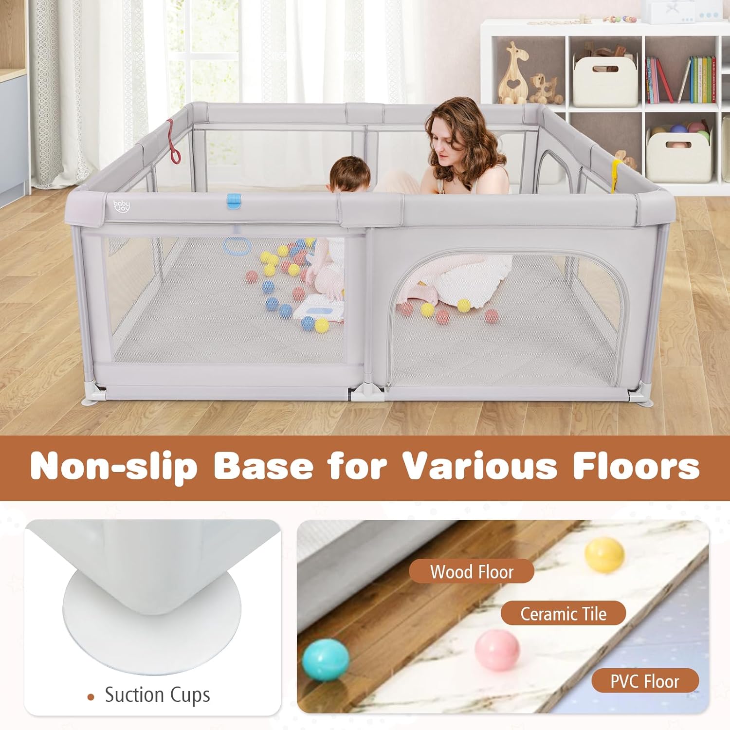 Description: Are you looking for something to make the baby stay in a safe zone and free your hands? Our baby playpen is exactly what you need. This 73" x 61.5" baby playpen provides a large area for kids to learn and play safely. The double-sided soft mat is made from child-friendly XPE material and features a non-slip & waterproof surface. 4 pull rings and 27" height design help your baby to learn to stand and walk. 50 ocean balls are included for more fun. Skin-friendly oxford fabric and soft sponge make the playpen a safe and cozy zone. For added security and convenience, it comes with breathable mesh walls, 2 zippered doors, corner protection design and a side mesh pocket. Supported by a heavy duty metal frame and fitted with non-slip suctions cups, this baby playpen stays in place firmly. Features: Large space for babies to freely sit, crawl, walk or play 27" scientific height helps babies to learn to stand and walk Comfortable and non-slip mat offers a cushioned surface Premium oxford cloth with tight stitches for long-term use Includes 1 carrying bag, 4 pull rings and 50 ocean balls 2 zipper doors for babies to crawl in and out with ease External zipper design ensures a secure closure Breathable mesh walls for better airflow and visibility Side storage pocket keeps toys and essentials within reach Soft sponge filling enhances comfort and safety Easy folding design for easy storage of the mat Sturdy metal tubes provide strong support Non-slip base for various floors Complies with ASTM for safer use Easy to assemble and dissemble Specifications: Color: Grey Material: 210D Oxford Cloth, Metal, Sponge, PP Product Dimensions: 73" x 61.5" x 27"/186 x 156 x 68 cm (L x W x H) Large Door Dimensions: 23.5" x 19"/60 x 48 cm (L x W) Small Door Dimensions: 29.5" x 19"/75 x 48 cm (L x W) Carry Bag Dimensions: 38.5" x 8" x 8"/98 x 20.5 x 20.5 cm (L x W x H) Net Weight: 18.5 lbs/8.5 kg Suitable Age: 0-3 Years Old Package Include: 1 x Baby Playpen 1 x Mat 50 x Ocean Balls 4 x Pull Rings 1 x Carry Bag 1 x Instruction