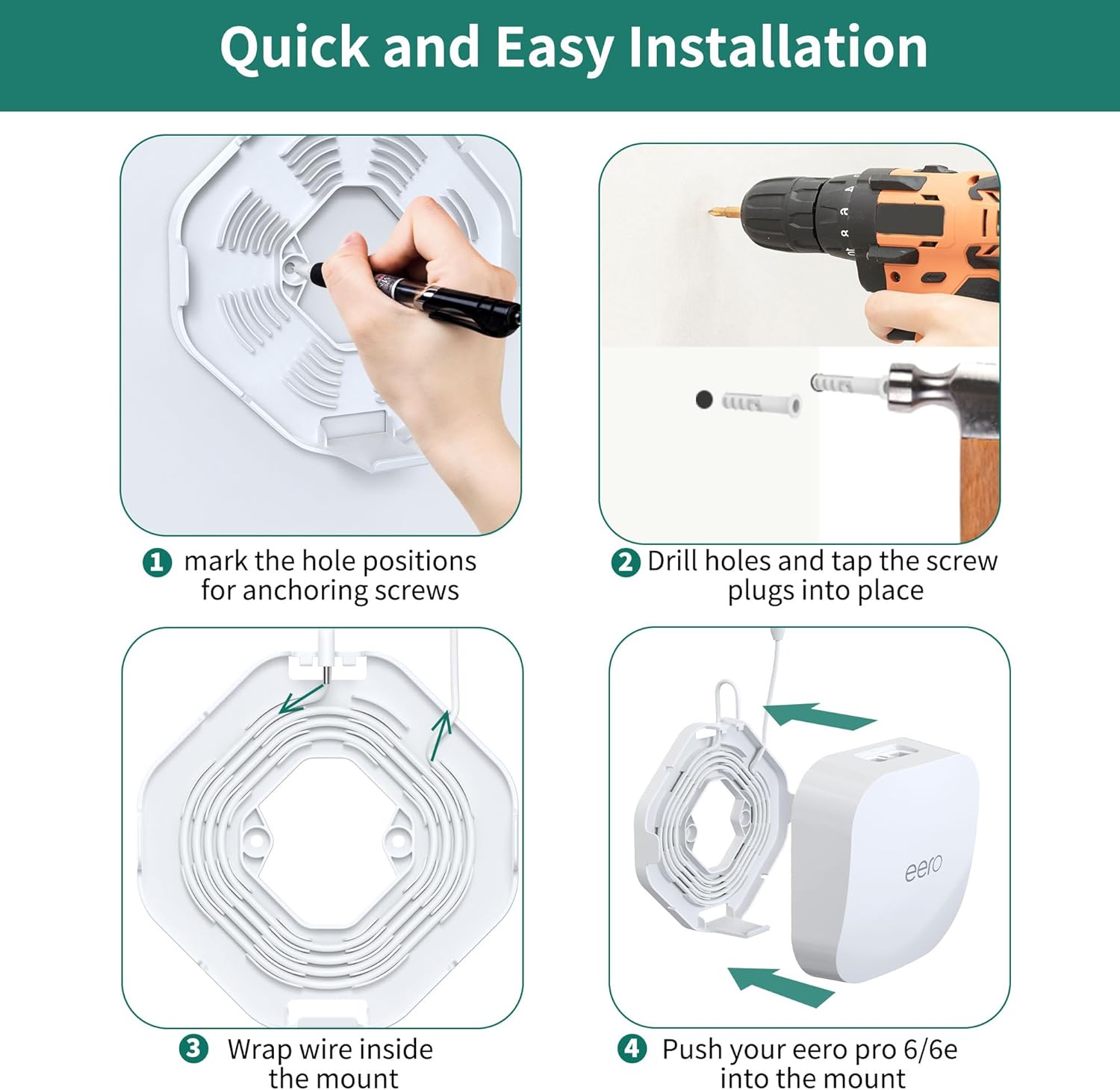 Professional Wall Mounting: Securely anchor your eero Pro 6 with our drill-and-screw installation. Enjoy a stable, permanent solution that keeps your device exactly where you want it. The package includes two erro pro 6 wall mounts