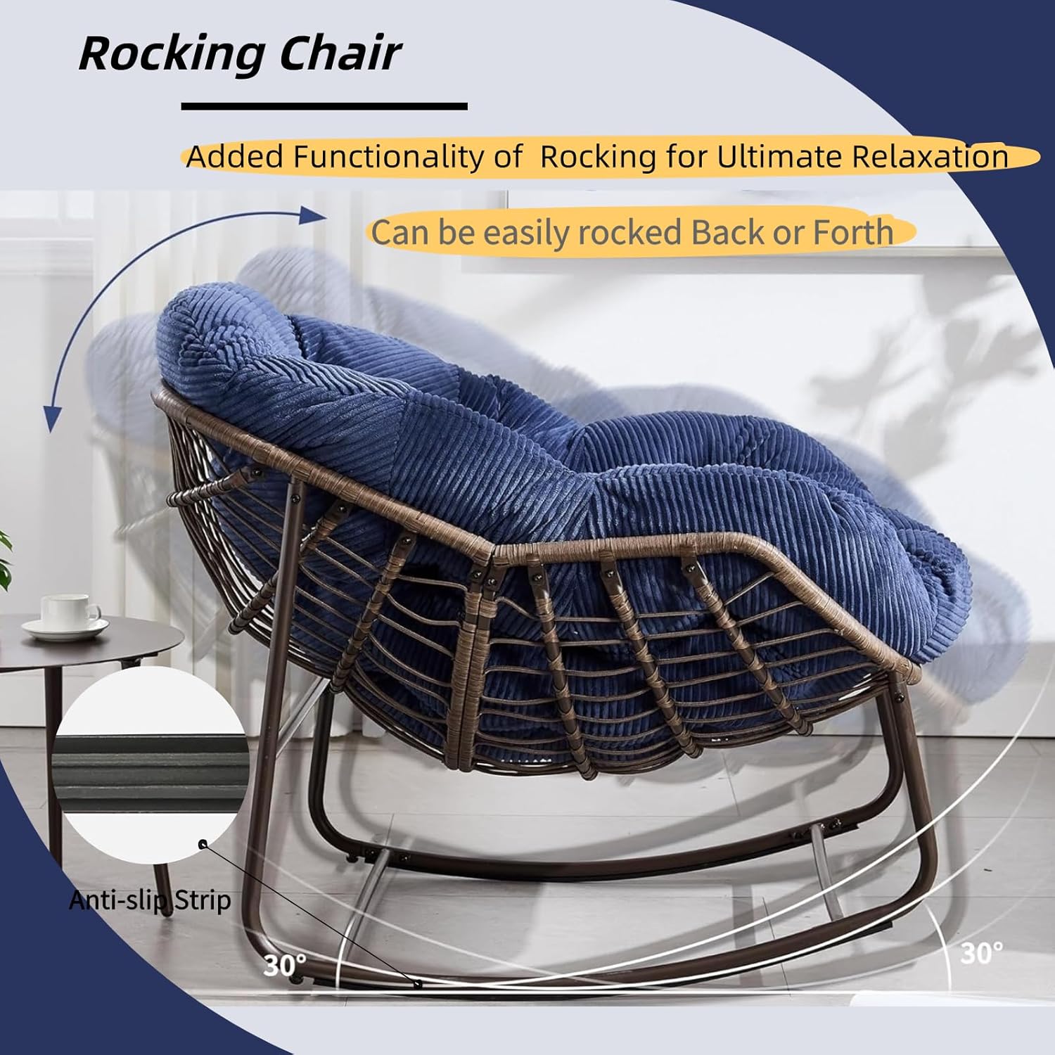 Indoor & Outdoor Front Porch Rocking Chair Set of 2, Rattan Rocker Padded Cushion Recliner Chair Outdoor for Patio, Yard, Garden, Living Room (Dark Blue)