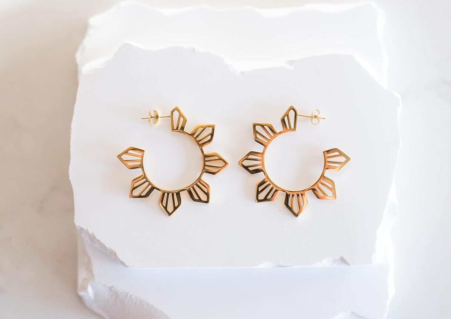 These beautiful sunflower-shaped dangle earrings are made of high-quality stainless steel and gold-plated, with a mirror finish. They are hypoallergenic, making them safe for sensitive ears. The earrings are 4cm in diameter and 4.5cm in drop length, making them a perfect statement piece for any occasion. Whether you're dressing up or down, these earrings will add a touch of elegance and sophistication to your look.