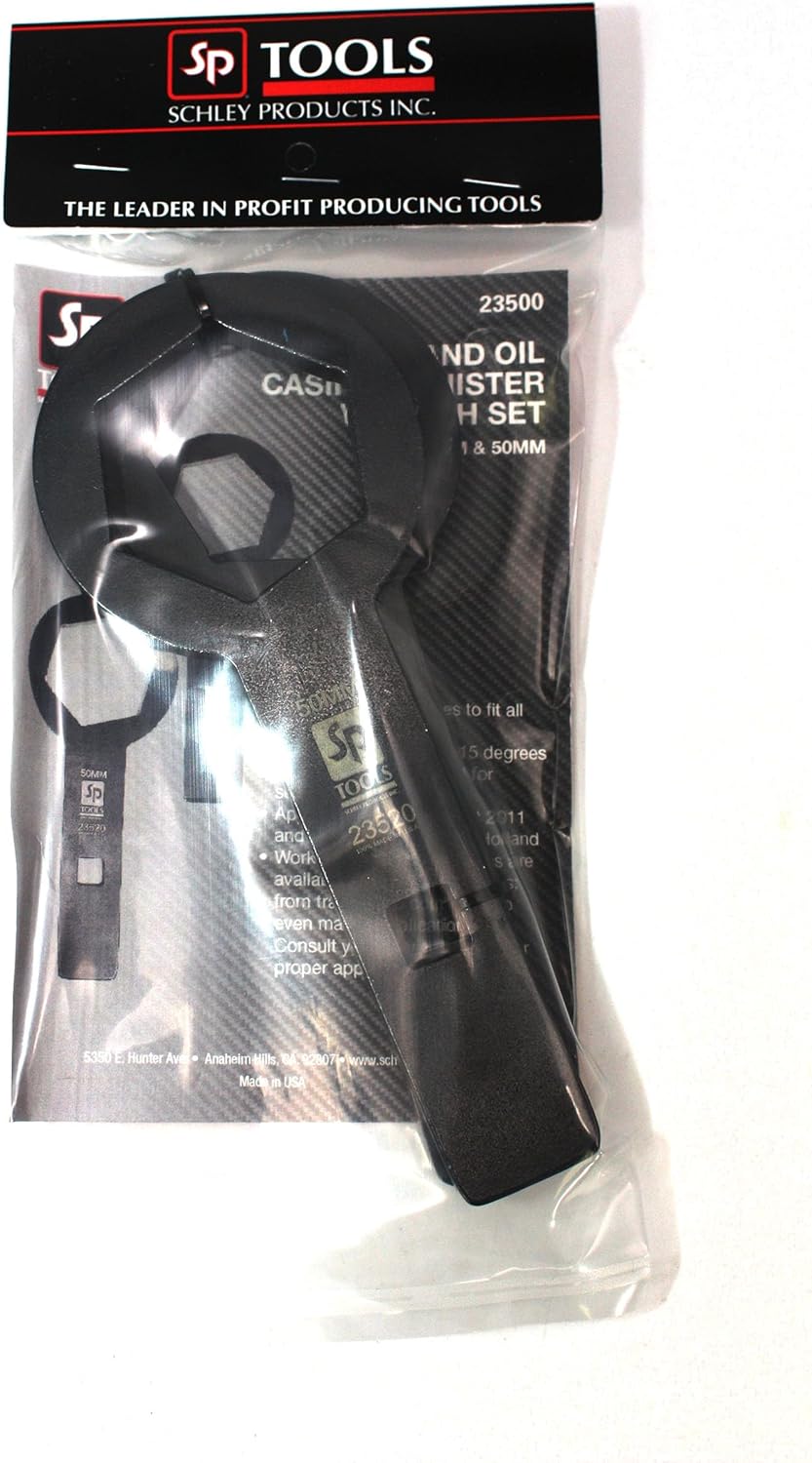Schley Products 23500 Fuel and Oil Casing Canister Wrench Set was engineered for removing oil or diesel fuel filter canisters from any Holland, Case IH combines and tractors using IVECO diesel engines. This wrench set is engineered to fit tightly around the filter housing, providing a secure grip that minimizes the risk of slippage or damage to either plastic or aluminum filter housings. This precise fit ensures effective filter removal without causing unnecessary strain on the filter housing. Each wrench incorporates a square drive enabling the use of a breaker bar or socket wrench when removing the oil filter housing combines and tractors that have Iveco FPT engines. Oil filter wrenches feature a The boxend is angled 15 degrees for flipping the wrench between rotations to maximize rotations and for finger clearance and working around obstructions that limit access to the canister. The wrench is built on a thick 3/8 steel lasercut for accuracy and polished and tumbled for a smooth finish and ease to grip. The wrench is black oxide coated for long life and ease of maintenance. Features. 48mm and 50mm sizes to fit all IVECO FPT engine filter canisters, both oil and fuel. Hand ToolsSpecifications. Weight 2 lbs