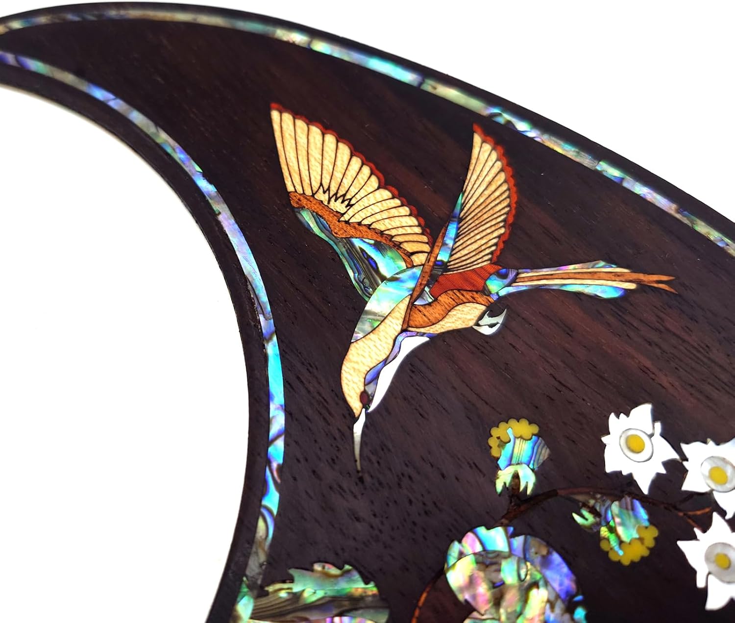 • 4. Real Shell Inlays: The abalone flowers are made from real shells, not stickers. These shells exhibit stunning color changes when viewed from different angles, adding depth and beauty to the pickguard.