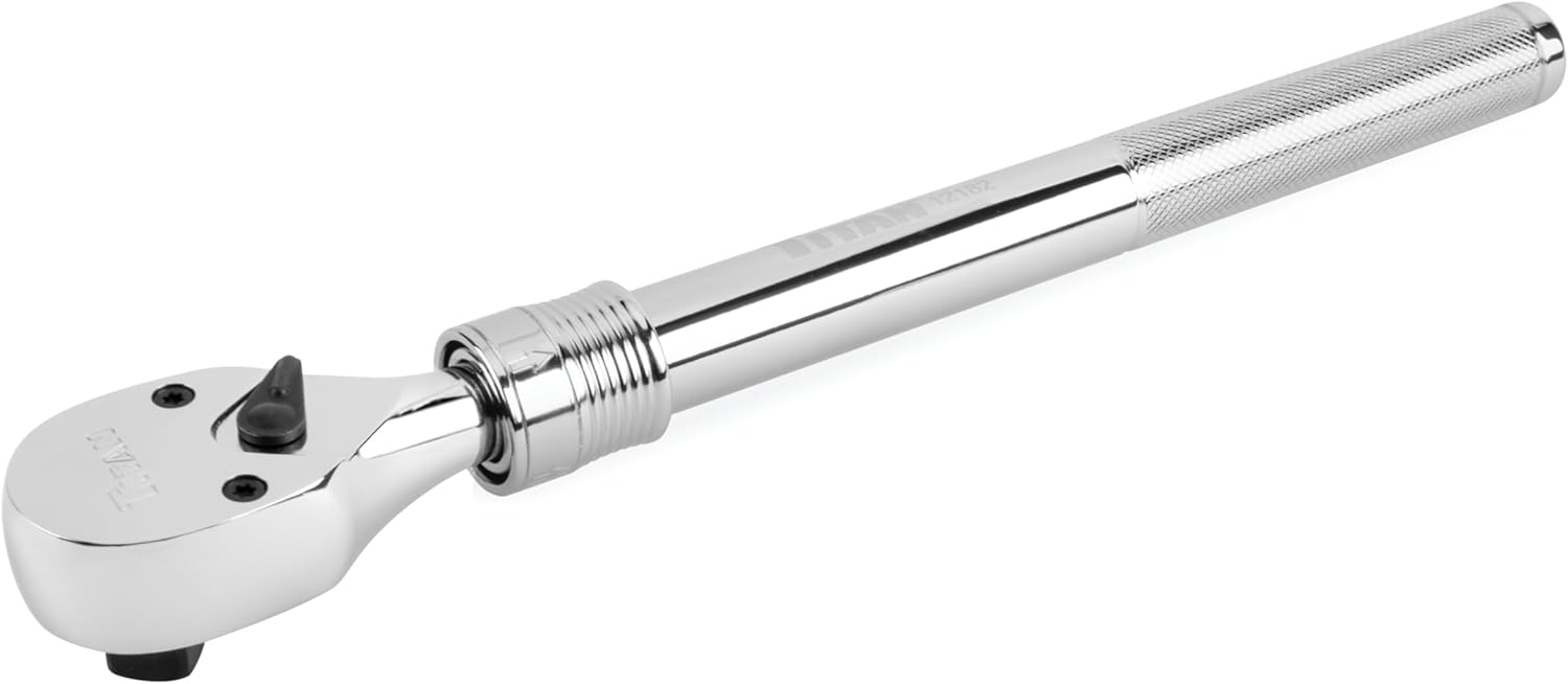 Titan 12072 3/4-Inch Drive x 19-1/2 to 30-1/2-Inch 72-Tooth Extendable Ratchet telescopes from 19-1/2-Inch to 30-1/2-Inch (495.3mm – 774.7mm) in 4 increments and features a 3/4-Inch drive. Constructed of chrome vanadium for durability and strength. Contoured cushion handle for max grip and comfort. Drive-end detent ball securely holds socket. 24-Tooth reversible ratcheting mechanism produces a sweep of 15 degrees. Telescoping ratchet is made in Taiwan.
