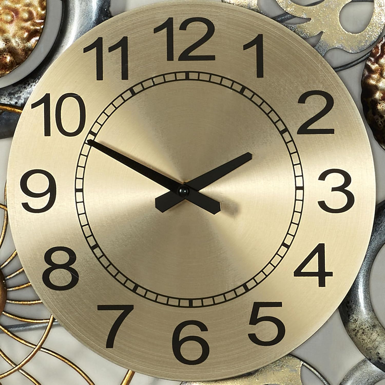 The Bronxx Wall Art Clock adds a chic abstract quality to your style, while also beautifully displaying the time. Handpainted and hand-finished with alcohol ink in captivating metallic gold, silver, and charcoal hues, the dimensional metal wall sculpture features openwork elements filled with swirls, rings, pressed textures, and radiating spokes against a curving framework. The center 9.5" dia. golden metal clock features black hands and bold numbers. Quartz movement requires one of your AA batteries. Overall, the wall art clock measures 34"Wx2.5"Dx17"H.
