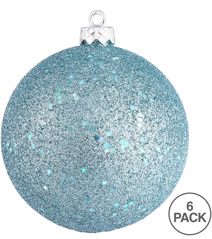 Vickerman 4" Baby Blue Sequin Ball Ornament. This ornament features sequin finish that will add shimmer to any holiday decorating project. This item is made from shatterproof plastic and utilizes a drilled and wired secure cap for reliable hanging. This unique ornament is an exceptional addition to any collection as it matches well with a variety of décor and goes perfectly on a holiday tree. Includes 6 ornaments per pack.