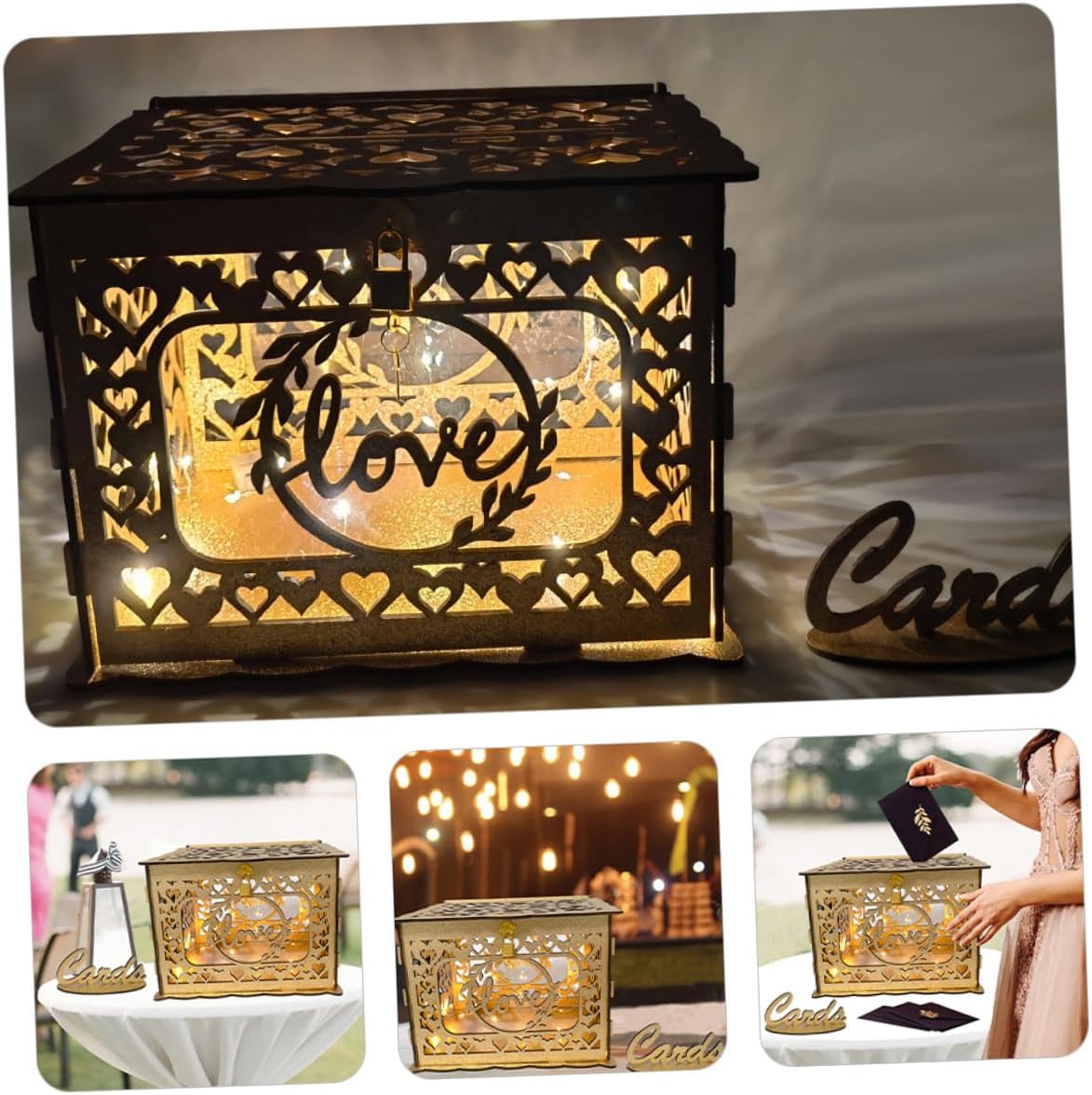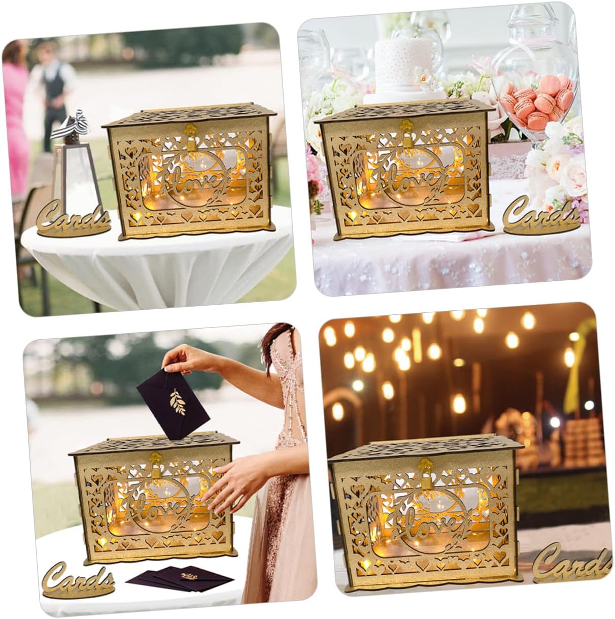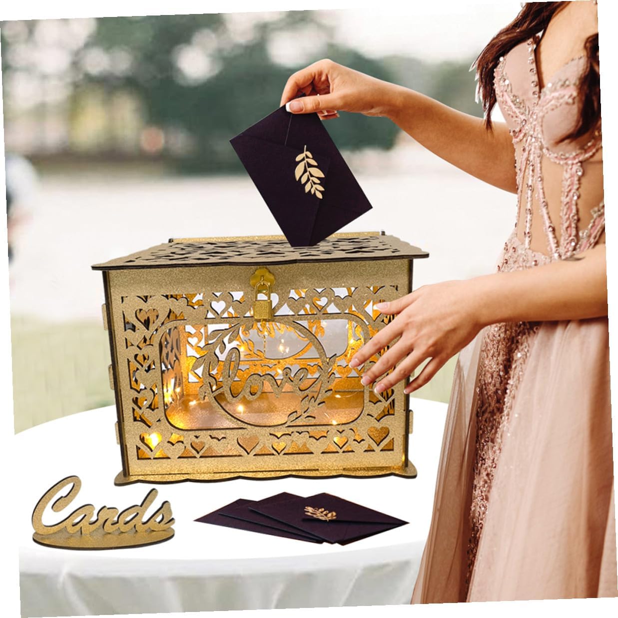 Package List 1 x Wood Box 1 x Sign 1 x Lock 2 x Keys Features -Product Info:Wooden hollow decorative box -Material:Wood,Acrylic -Color:Golden -Size:30.00X24.00X22.50cm/11.79X9.43X8.84in - Large enough to store cards or envelopes. You can also put money, postcards or small it card boxes for parties. - Elegant hollow design and wedding cards box, easy to assemble, you will enjoy DIY joy anniversary cards container. - An additional decor for wedding party, this wooden box can add more charm, beauty to your event. wedding card holder - Carefully down to every detail to give this wedding cards wooden box and elegant look. - Not only a cards box for collecting cards, but also can be used as a keepsake box to store photos, etc.Goods Informationgreeting cards container Made of wood with elegant hollow design, it is crafted to complement modern wedding looks.wedding card boxes Concerned about the safety of the cards and at your wedding or event? This wood case will be a good choice for you.wedding card holder The unique decor of your table, or let look of the box stand on its own