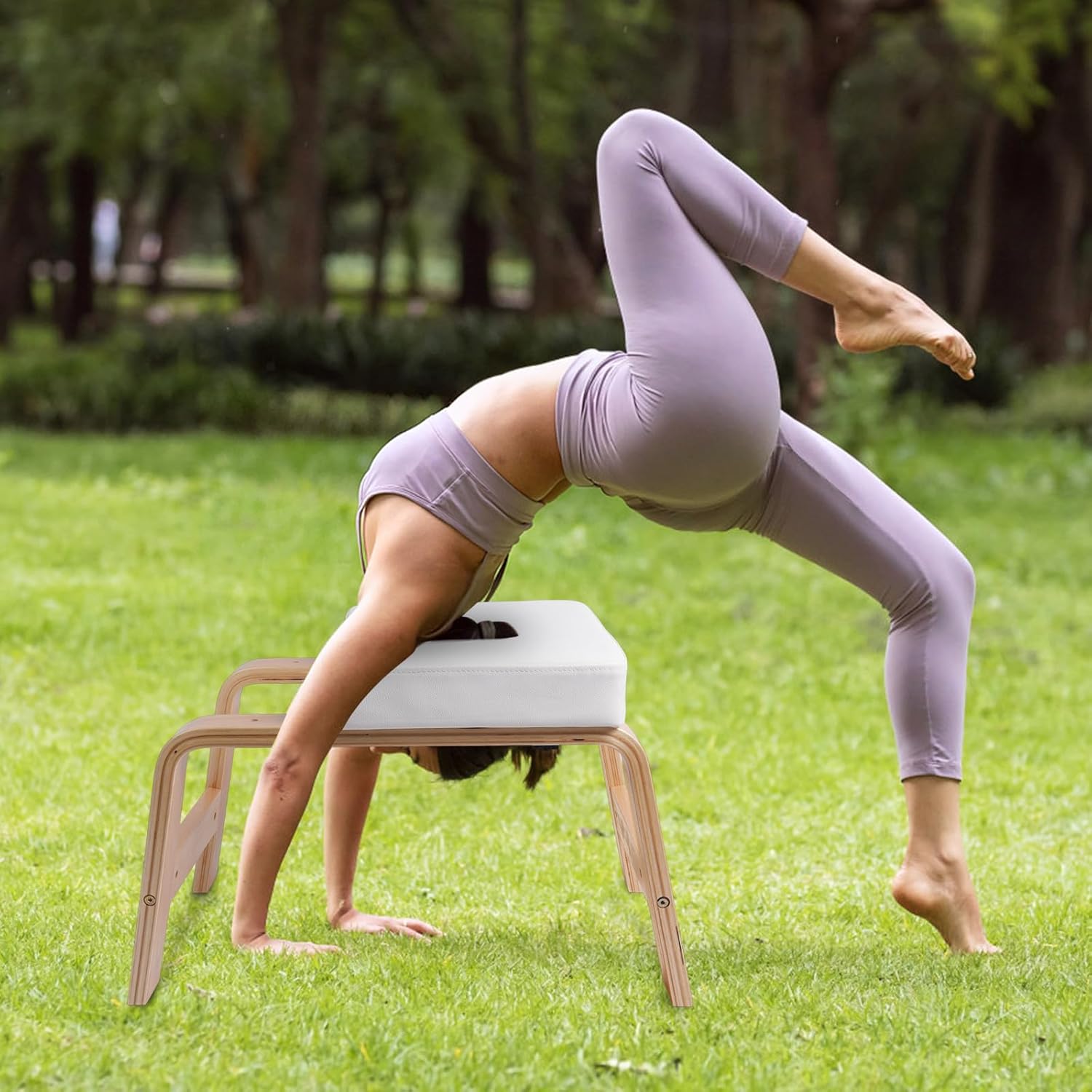 Specification Specification details Size: 14.96 inches high x15.56 inches longx23.62 inches wide (compact design, space-saving) Package includes: Inverted stool body x 1, installation tool x 1 Material: one-piece bending process, load-bearing 300 pounds Cushion: 2.5-inch high-density PU sponge, non-slip PU leather surface Additional functions: removable cushion, non-slip foot pad, free asana guide poster Applicable scenarios: home yoga, gym, office, travel 1. Safe and professional design: Unassisted inversion is the main cause of yoga injuries! This product is designed with a trapezoidal expansion base and non-slip pad to eliminate the risk of tipping, protect the cervical vertebrae and spine, and make inverted practice safer. 2. Scientific decompression cushion: The thickened 2.5-inch cushion evenly disperses the pressure on the head and shoulders. The PU material is skin-friendly and breathable, and you won’t sweat after practicing for a long time. It can be cleaned with just one wipe. 3. One stool for multiple uses, unlocking all body poses: Not only an inversion stool, but also a yoga brick, meditation stool, shoulder-opening auxiliary tool, supporting 20+ poses such as flat boat pose and pigeon pose, with posters to guide daily practice. 4. Suitable for everyone from beginners to masters: beginners can quickly get started through the four-step tutorial, and advanced players can challenge difficult balance; inversion promotes blood circulation and improves digestion, and 5 minutes a day awakens the vitality of the whole body!